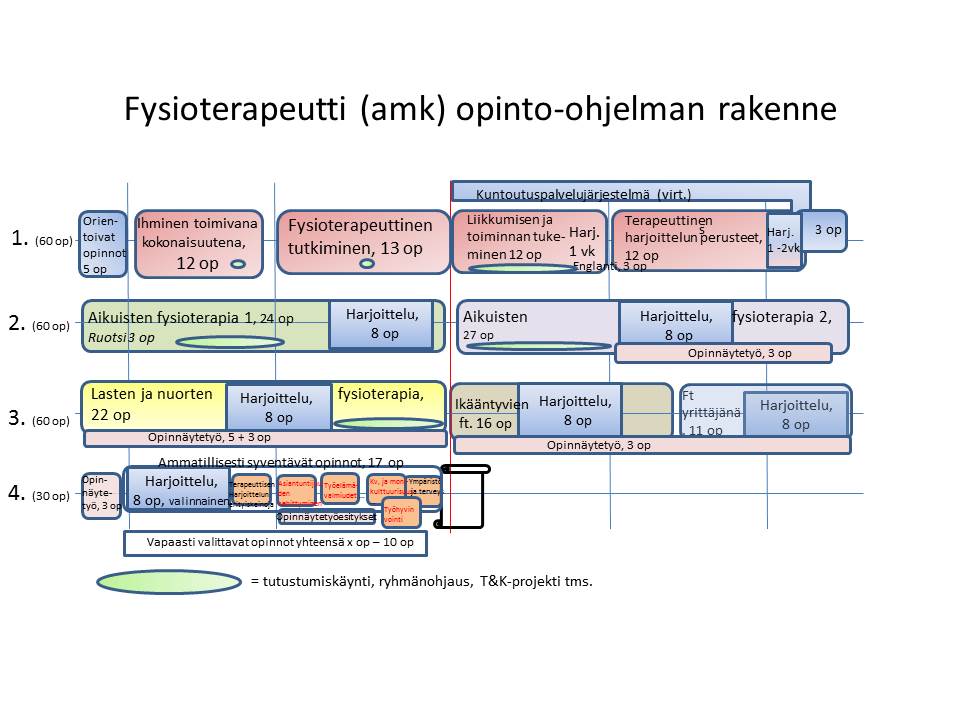 Physiotherapy has it’s basis in physiotherapy science. Studies in the degree programme consist of professional studies, Bachelor’s thesis and elective studies. Larger modules are divided into smaller study units. The knowledge of different subjects is integrated to develop student´s individual knowing. The programme contains 81 ects gredits worth of practical training and 48 of those are studies in different clinics or other practice surroundings.