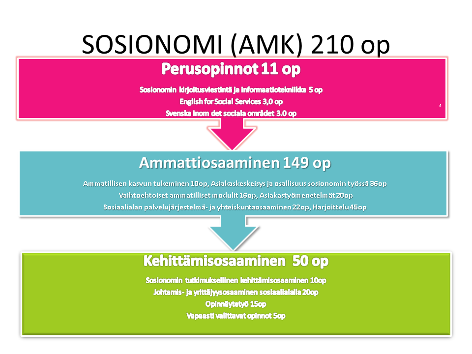 Sosiaalialan työ on luonteeltaan asiakas- ja voimavarakeskeistä. Alan työntekijältä vaaditaan reflektiivisyyttä, luovuutta ja tutkivaa otetta omaan työhön. Toiminnan ohjaus ja kehittäminen sekä verkostotyön osaaminen ovat kaikille yhteistä osaamisen aluetta. Monikulttuuristuva yhteiskunta edellyttää myös kielitaitoa sekä kulttuurisensitiivistä työotetta. Opetussuunnitelma perustuu työelämän toiveiden mukaisesti laaja-alaiseen sosiaaliohjausosaamiseen. Samalla vaihtoehtoiset ammatilliset modulit, harjoittelut ja oppimisprojektit tuottavat erityisosaamista, mitä työelämä myös toivoo. Sosiaalialan yrittäjyyden sisällyttäminen opetussuunnitelmaan tuo sosionomeille tietoa monimuotoisesta palvelujen tuotannosta.