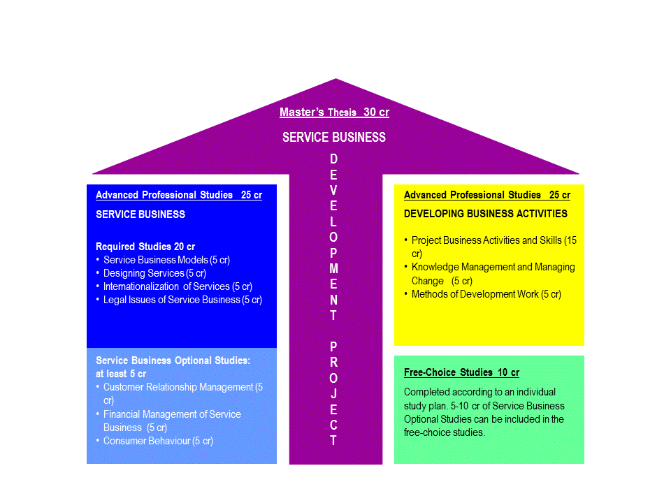 Koulutuksen tavoitteena on asiakaslähtöisen palveluliiketoiminnan kehittämisen ja toteuttamisen erityisosaaminen sekä projektipäällikön valmiudet. Opiskelija syventää tietojaan ja taitojaan palveluliiketoimintakonsepteista ja -prosesseista sekä niiden suunnittelemisesta kehittäen samalla johtamiseen, projektitoimintaan ja tutkimukselliseen kehittämistyöhön liittyvää osaamistaan. Jo opintojensa aikana ja erityisesti valmistuttuaan opiskelija on organisaationsa palveluliiketoiminnan asiantuntija, muutosagentti ja projektiosaaja. Hän toimii työelämässä aktiivisena palveluliiketoiminnan tutkijana, suunnittelijana, kehittäjänä, toteuttajana ja arvioijana.