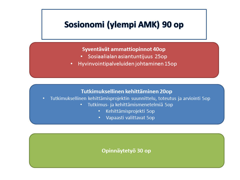 The thesis forms the centre of the studies and it is supported by the course contents and methods. The thesis and learning tasks develop new operational practices for social work and multiprofessional social services and their management. The subjects of the thesis and learning tasks are based on the development needs of working life.